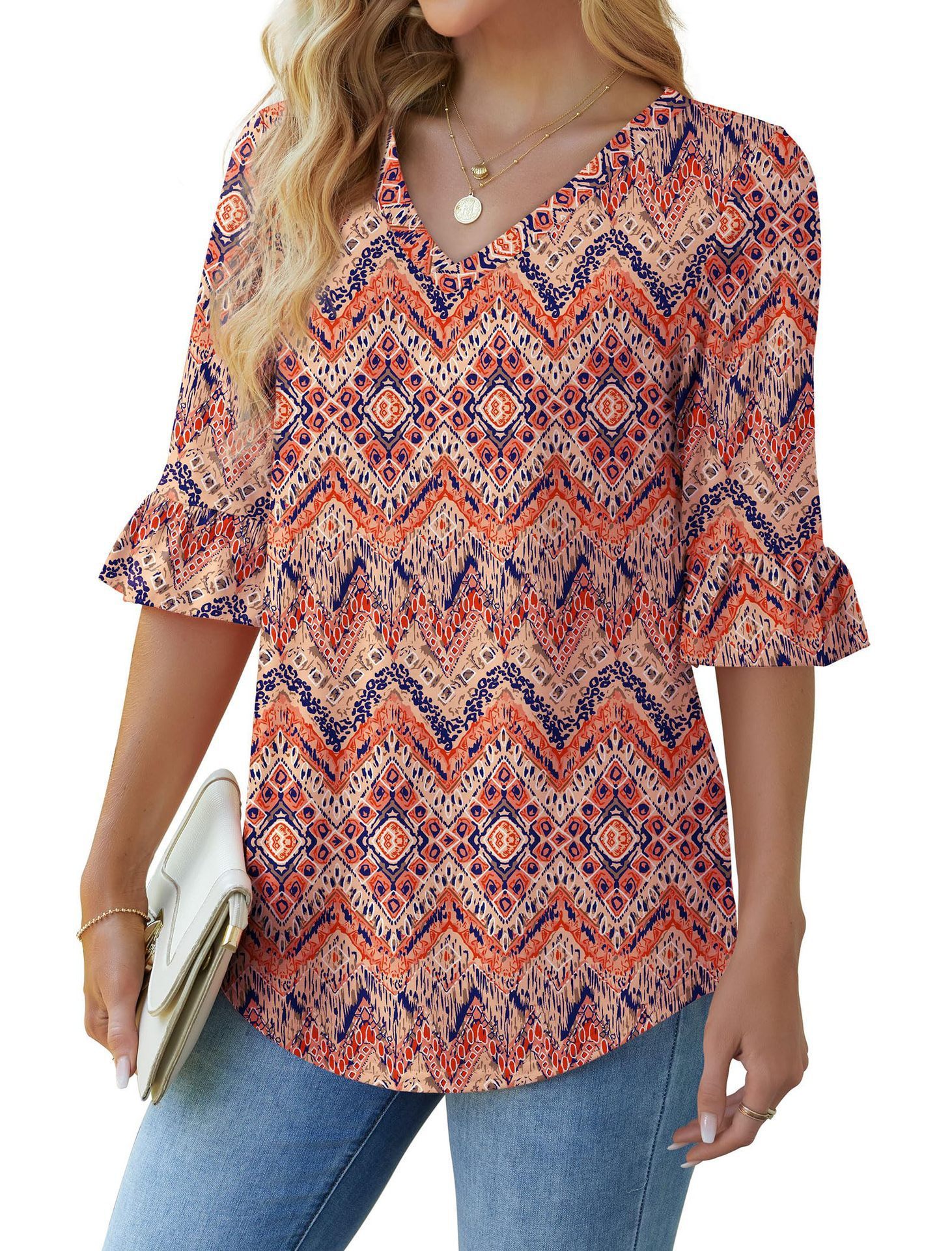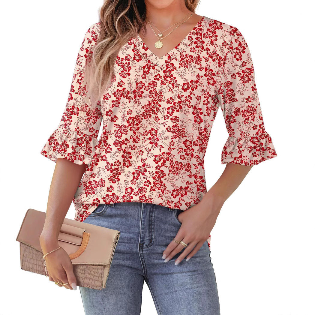 Printed Shirt V-neck Floral Flared Half Sleeve Top