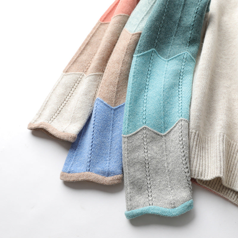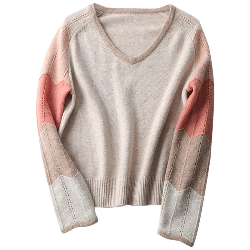 Contrast Color Woolen Sweater Women V-neck Pullover Patchwork Color Thermal Knitting Sweater Women