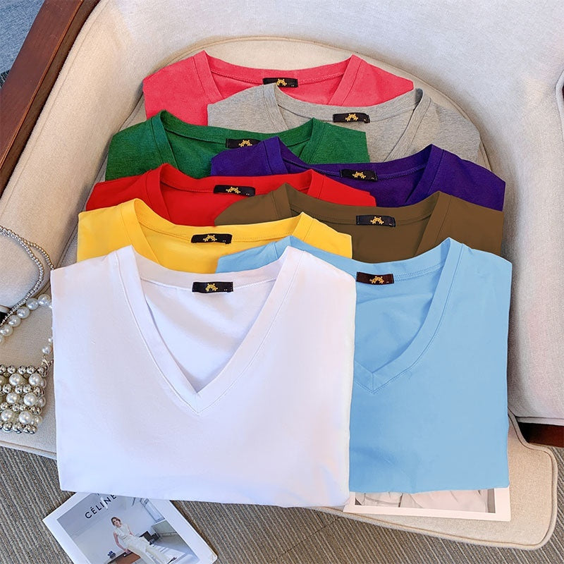 Summer Pure Cotton Short Sleeve T-shirt Top V-neck Loose